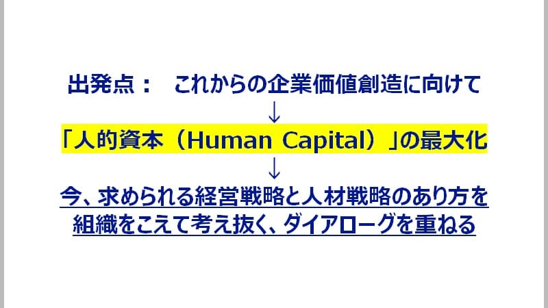 経済産業省から出された「人材版伊藤レポート」(持続的な企業価値の向上と人的資本に関する研究会 報告書)は皆さんも読まれているでしょうか?そこでは、人的資本を最大化しましょうという方向性が書かれています。ただ、皆さんもそのレポート読むと分かると思うんですけども、やりかたが書いてないんですよね。その「やりかた」について、皆さんと一緒に考えたいっていうのが今回の狙いです。