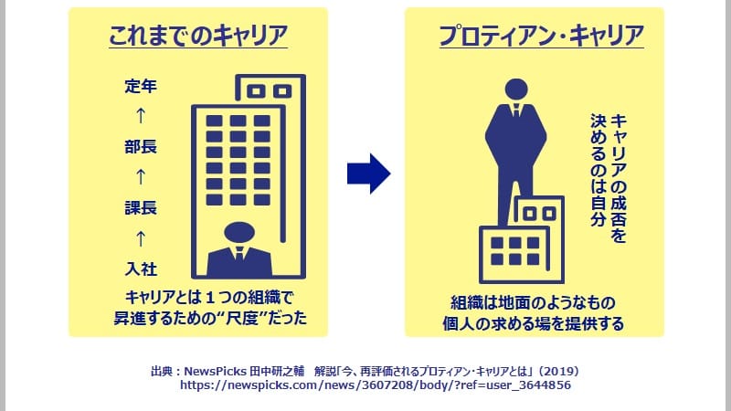 従来型のキャリアである、一つの組織の中で昇進、昇格していくという組織内キャリアも大切だとは思っています。しかし、これからのキャリアというのは自律型のキャリア、キャリアオーナーシップを持つキャリアだと思っていて、その最新の理論として、変幻自在なキャリア論である「プロティアン」を提唱しています。
