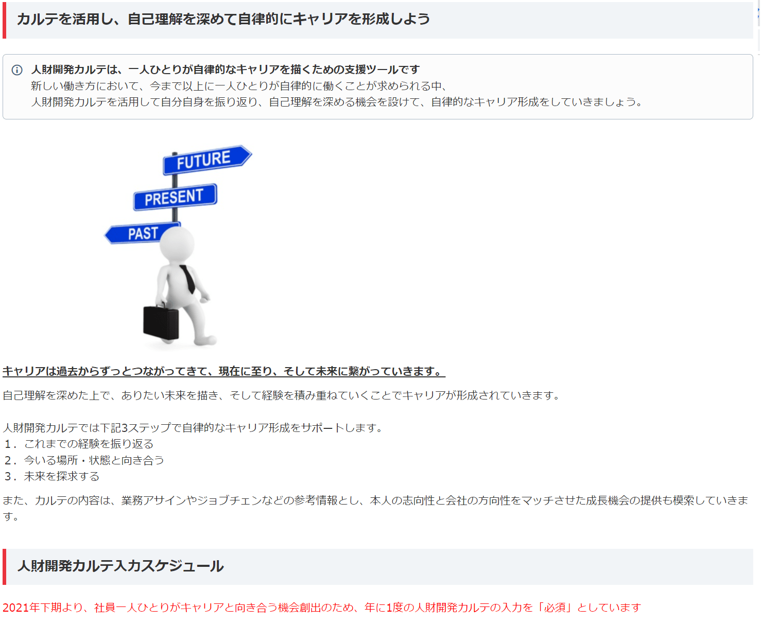 キャリア自律をしようと思ったら、自分の現在の立ち位置をしっかり把握し、自己理解を深めることがスタートラインになります。カルテは、1on1を通じて、社員自身の立ち位置の認識合わせをするためのツールです。