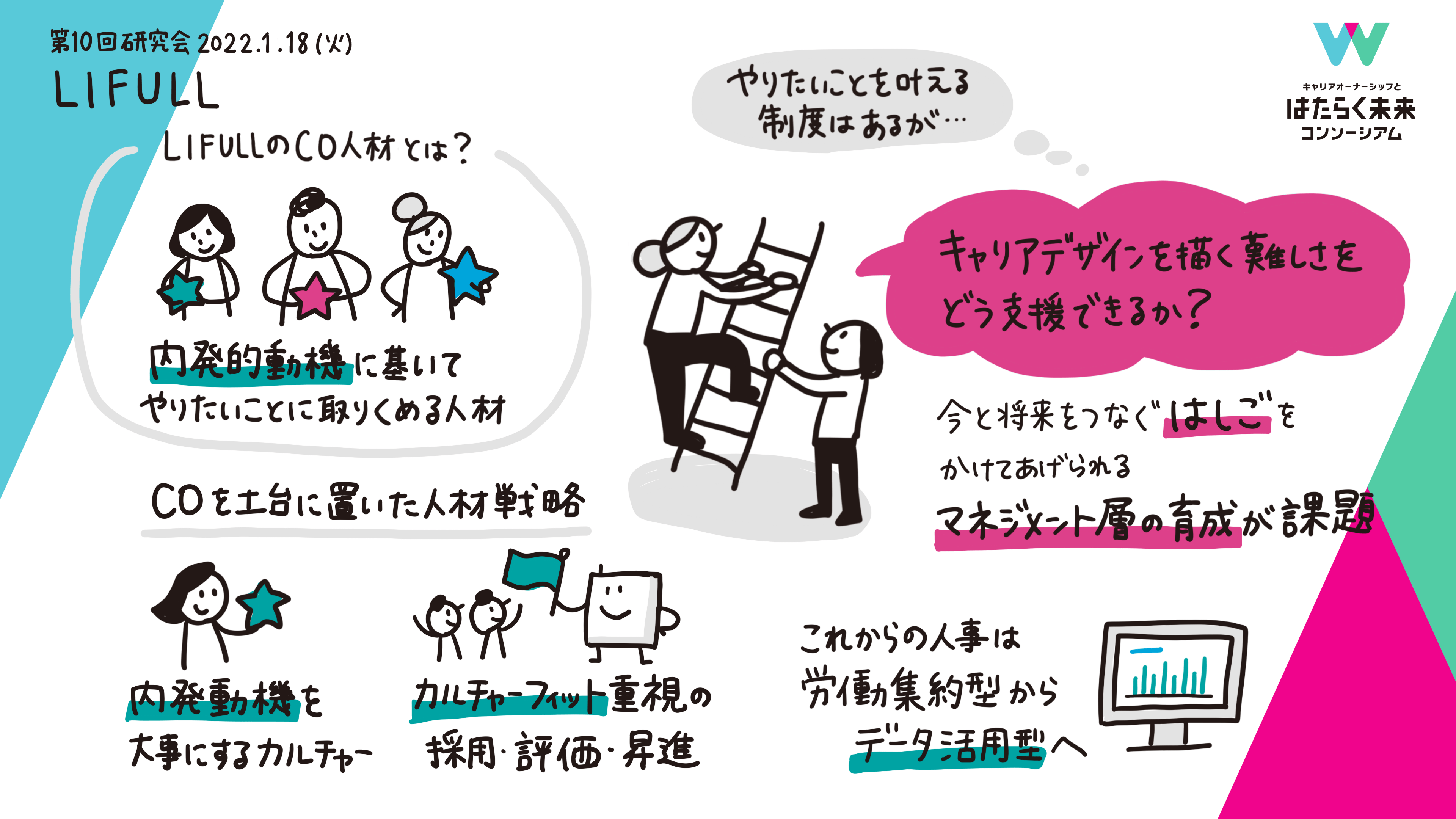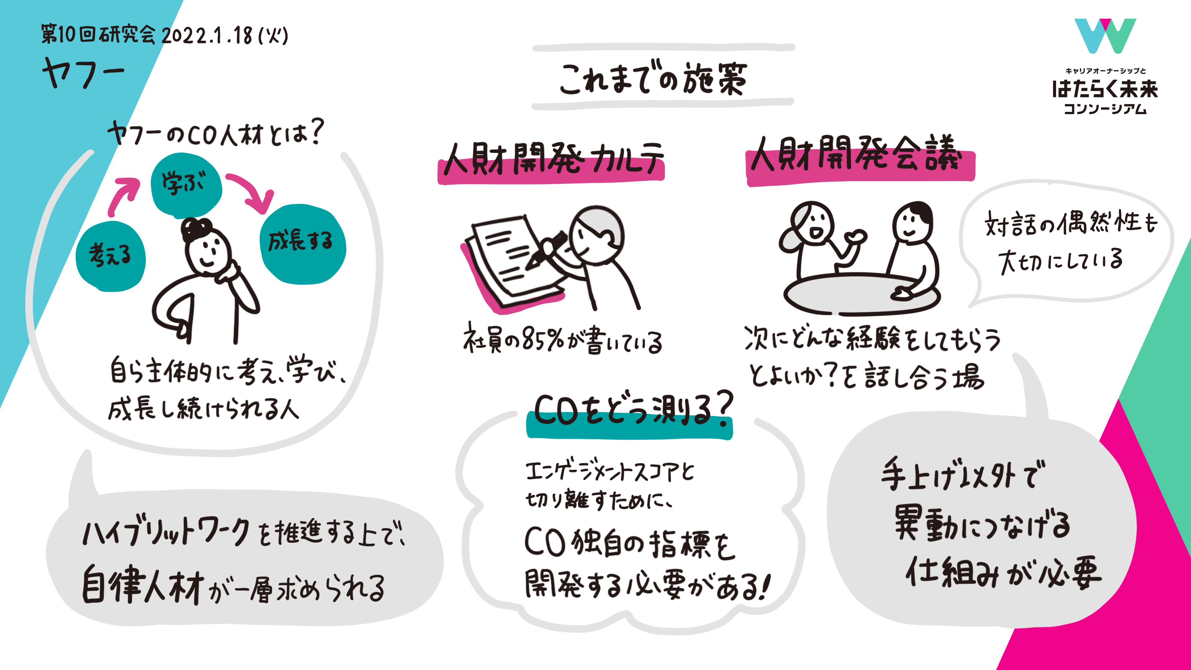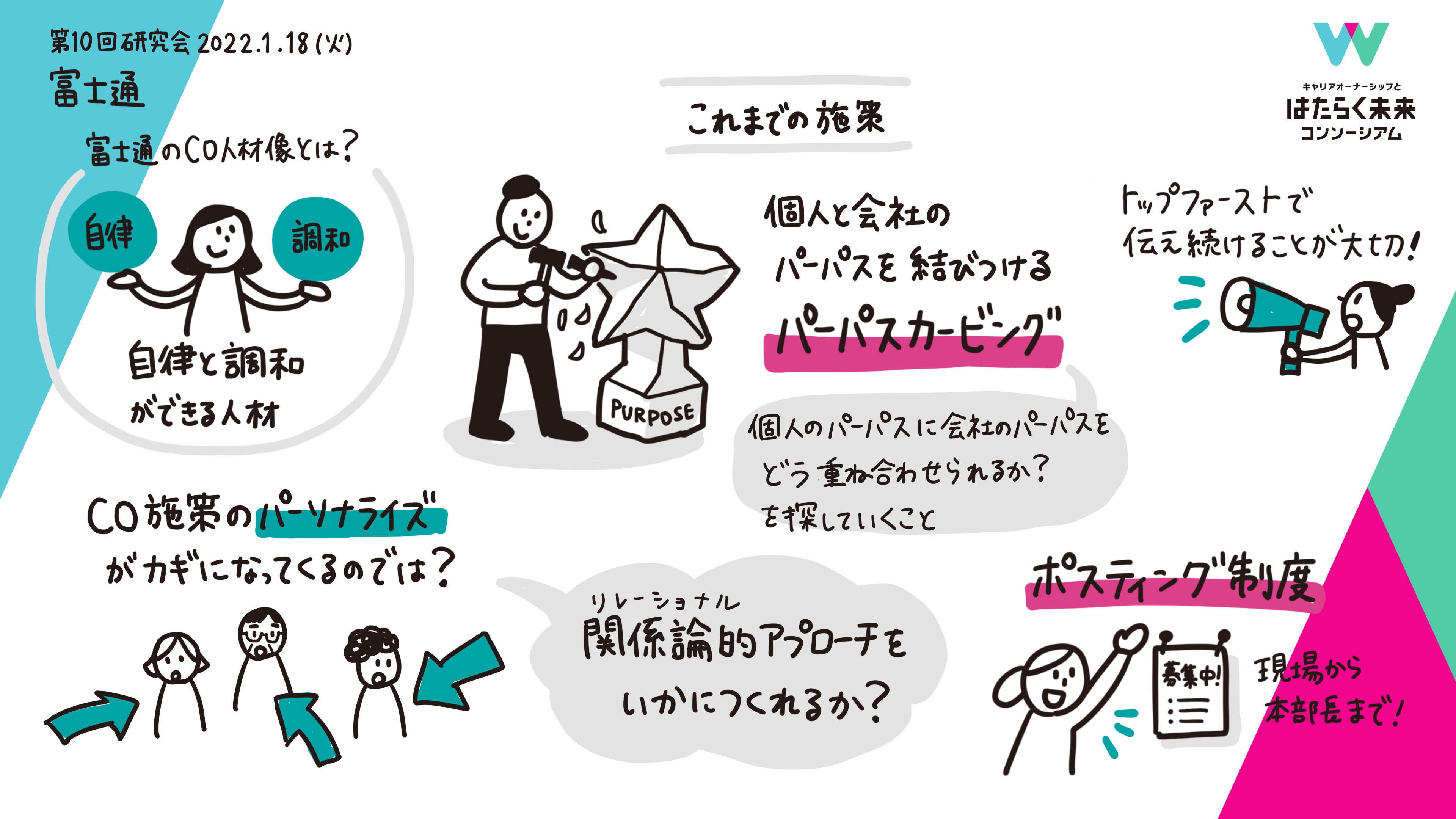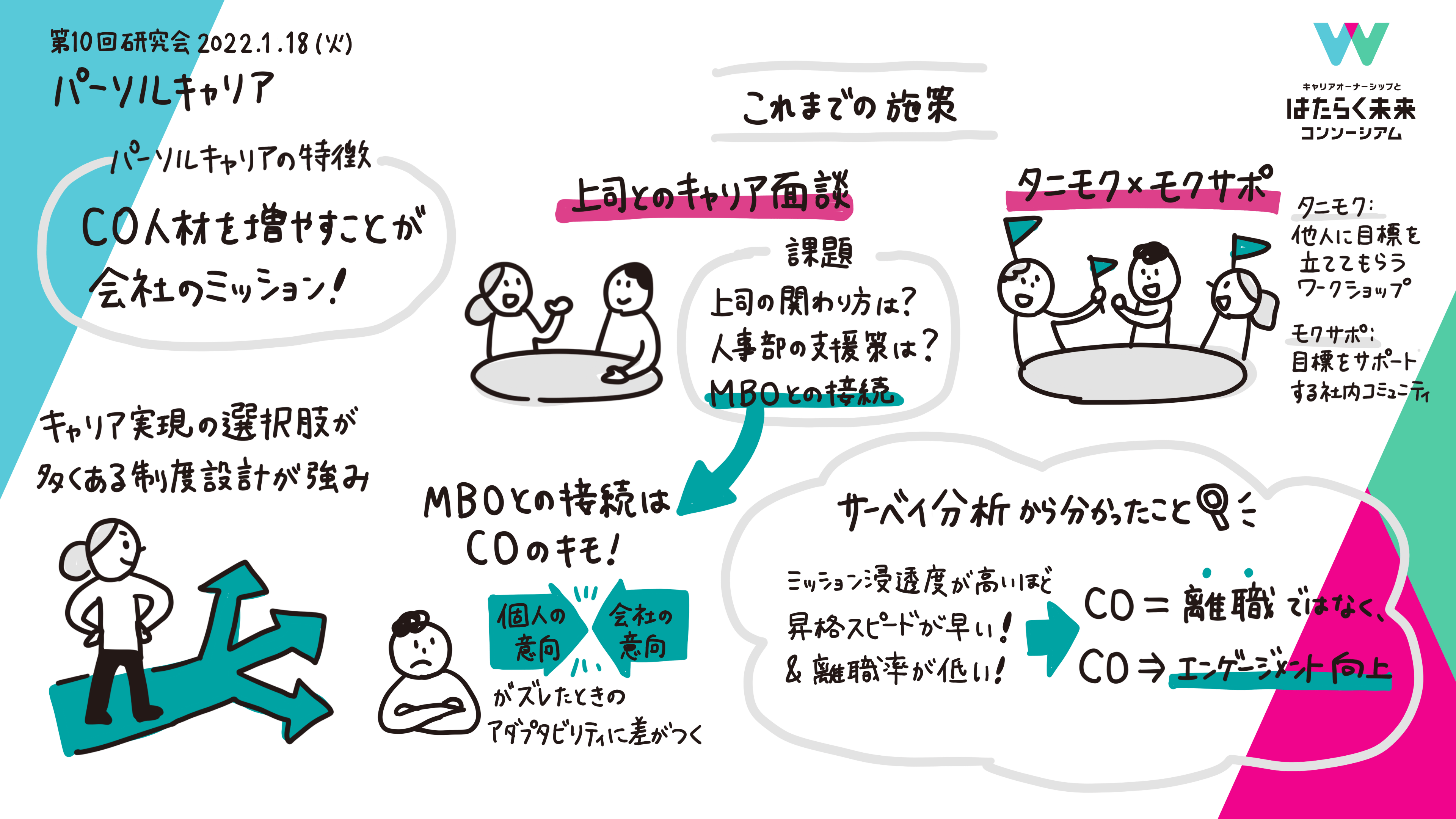 2022年1月18日、「キャリアオーナーシップとはたらく未来コンソーシアム」の第10回 研究会が開催。第10回 研究会では、第9回に引き続き各社に作成いただいたキャリアカルテを発表いただき、参画企業同士でのディスカッションを実施しました。