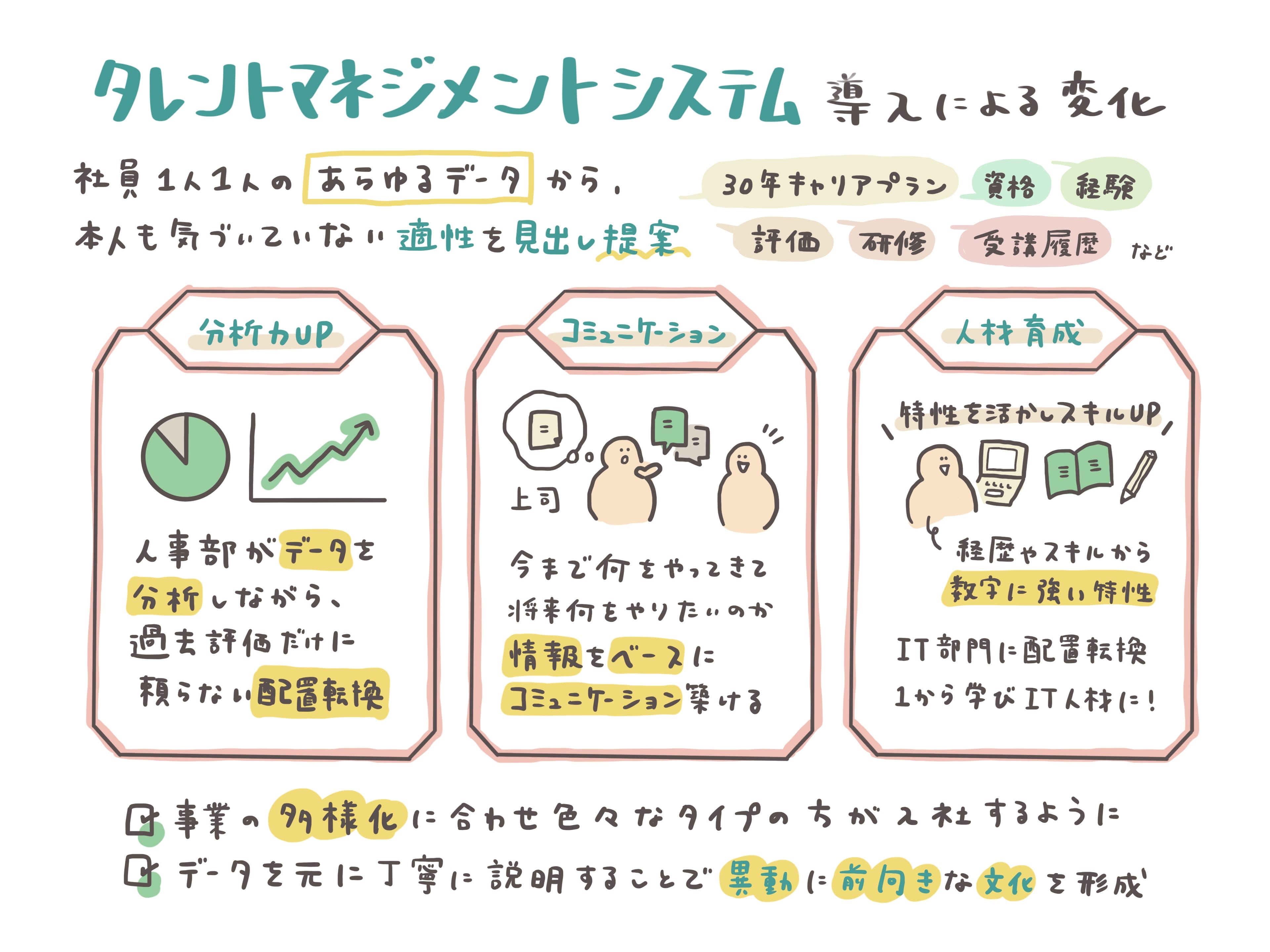 永島:もちろん一番大きいのは、人事部が、1on1の結果や30年キャリアプランなどのデータをちゃんと見て分析しながら、過去評価だけによらない配置転換ができるようになったことです。