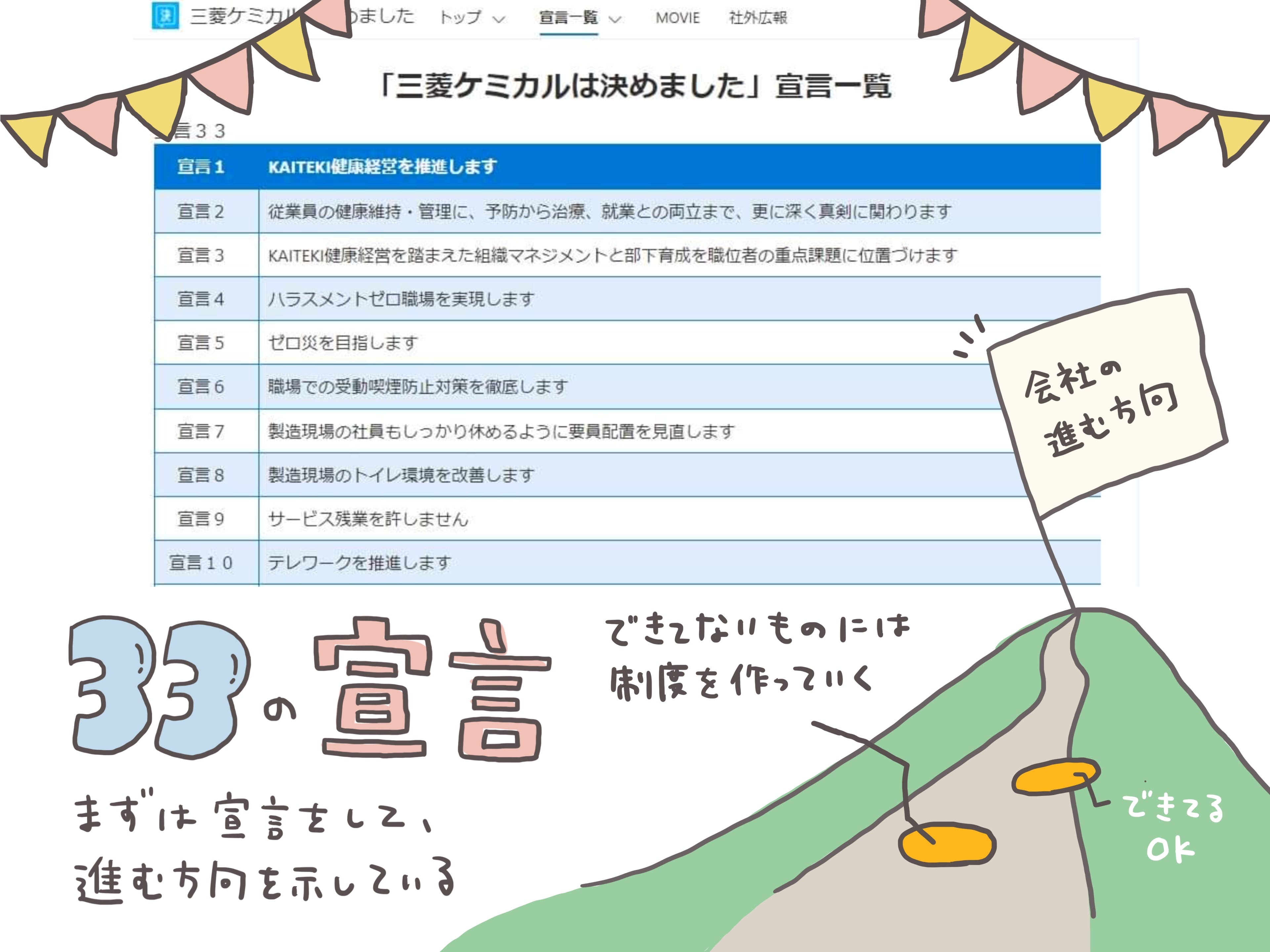 これが「三菱ケミカルは決めました」という30の宣言です。(※現在は一部変更し、33の宣言に)既に実施していることだけでなく、これからはこの方向に進みたいということも併せての宣言です。人事制度を変えるのには時間がかかりますが、先に「こういう方向に会社は進んでいきますよ」と宣言して、そこから制度に落とし込んでいくという進め方です。