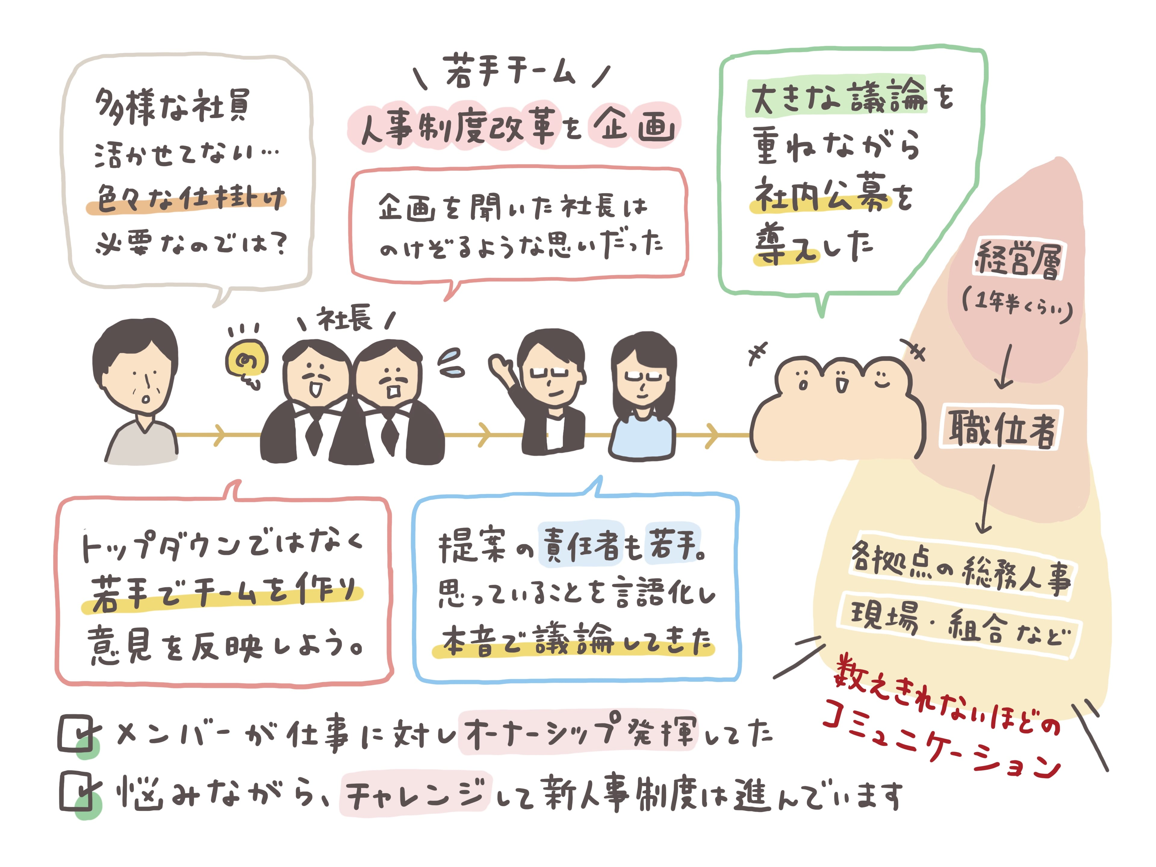 人事制度が変わって定着し、改革の実りを得るであろう10年後くらいには、彼らが会社の中核となる。その人達が働きたいと思えるような会社にするためにはどんな制度にすればいいのかを考えてほしかったのです。その結果、役員も驚くような提案がなされました(笑)。