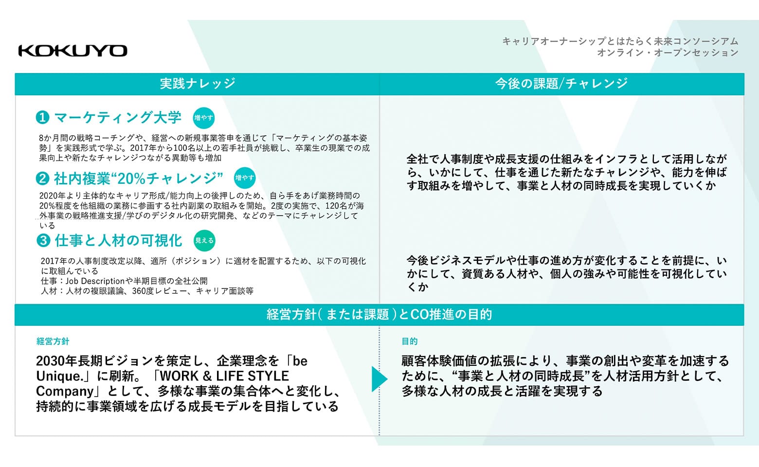 コクヨ: 社外の人の受け入れは、社内の取り組みと全く別のものだと考えています。社外で兼業・副業をしたときは、それを知見として社内に持って帰ってきてもらって、その知見を実践いただくことで社内の人材が多様化するというスパイラルだと考えています。