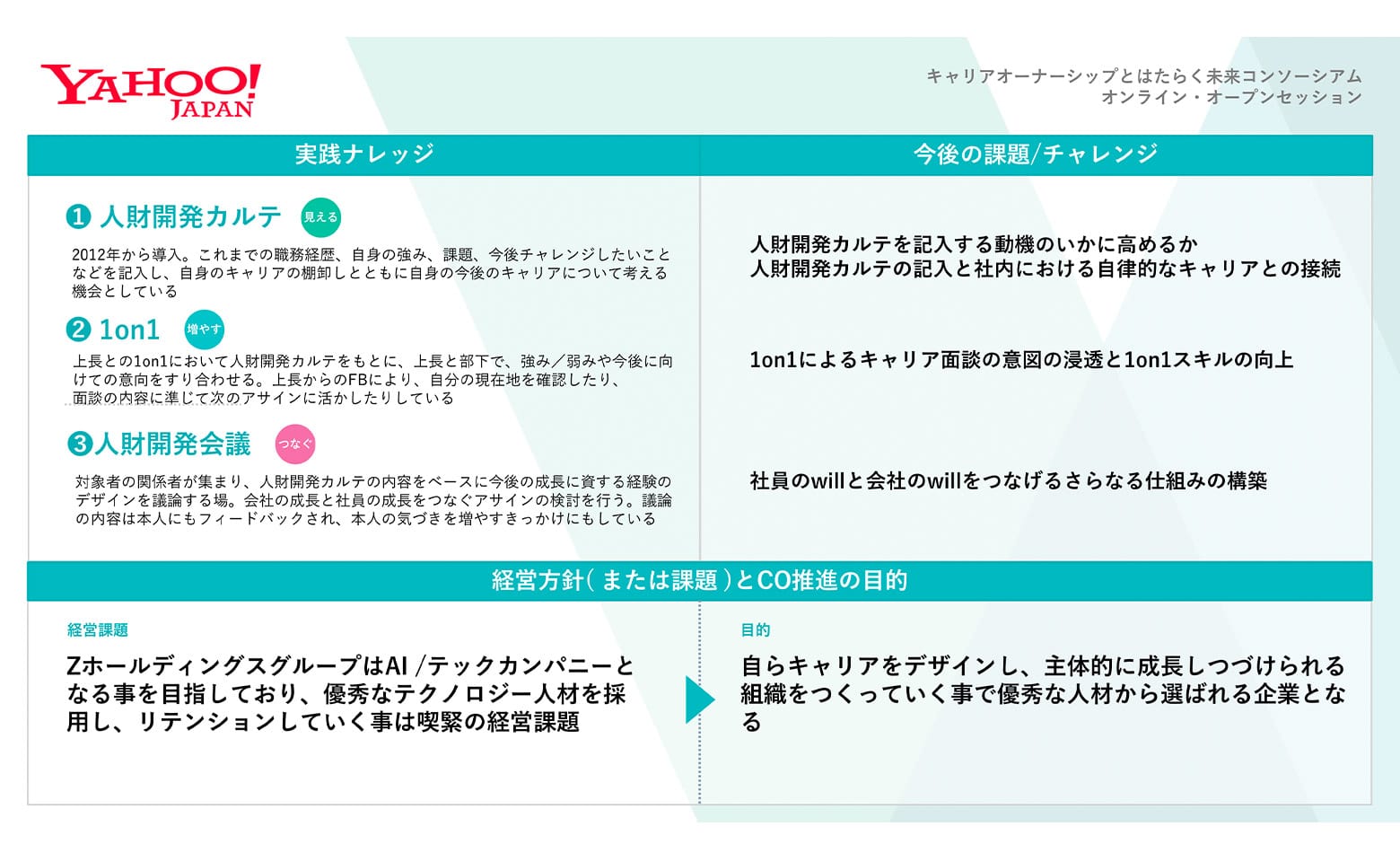 ヤフー: 社員のキャリアオーナーシップを高めると、離職するのではないか、という懸念が多くの方から聞かれます。この事実が証明する通り、一個人として色々なキャリアを描いたとしても、機会が一個社に閉じてしまうとどうしても限定的にならざるを得ないと考えています。