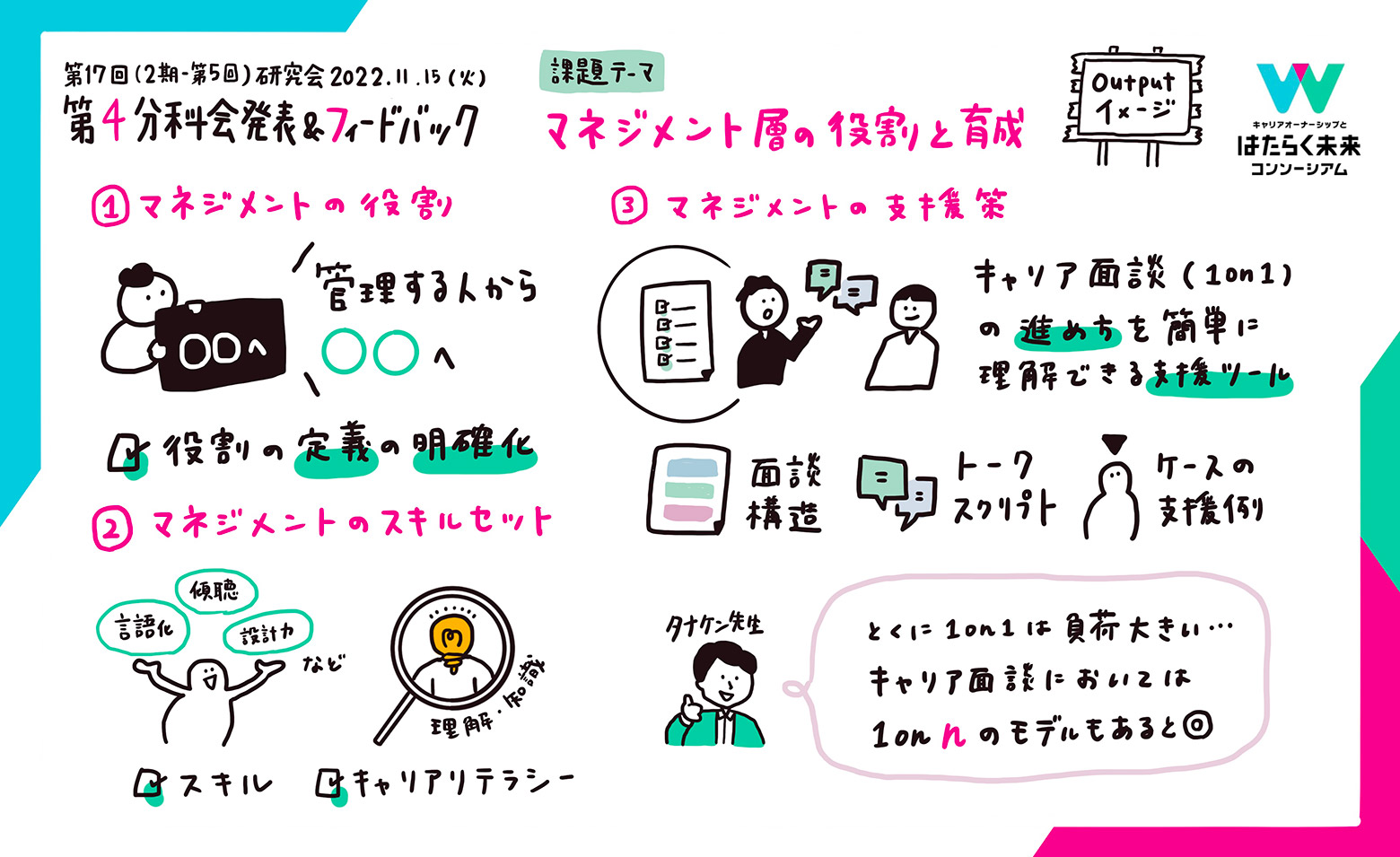 「キャリア面談をしよう、と言っても『何したらいいんだ?』と、双方が感じている面もあるかなと感じています。たとえば、『働き方を話しましょう』くらいの温度感から入ってもよいのではないかと思いました。今どう働きたいか、将来どう働きたいか、は、各自会話も進みそうですし、結果として、キャリアを相談することにつながるのではないでしょうか」