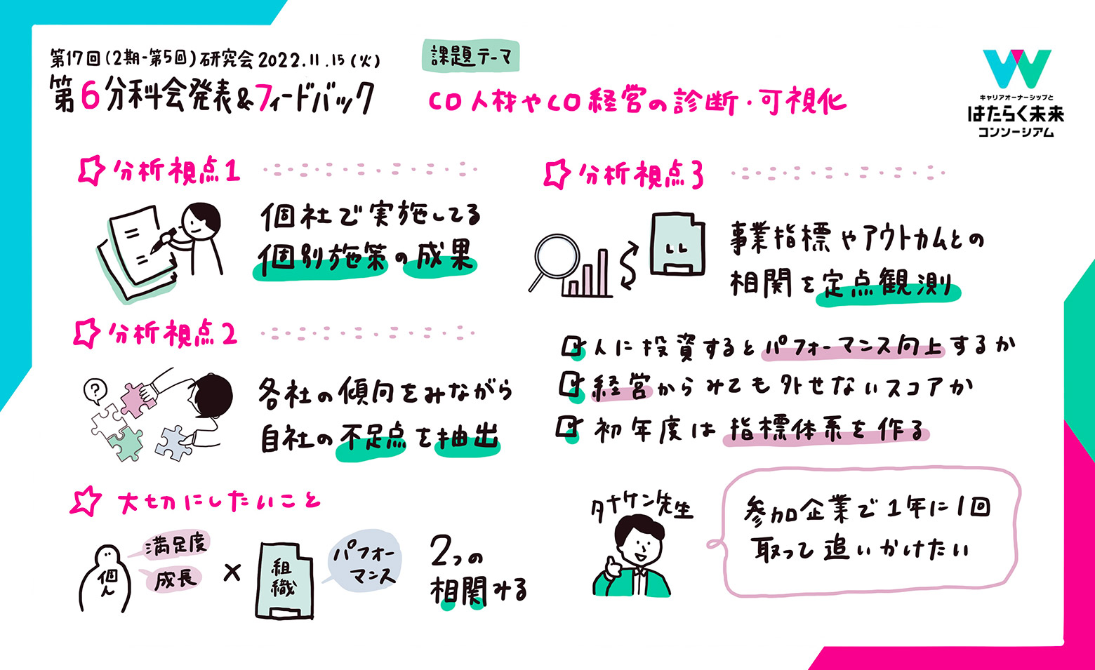 なお、社員ごとのパフォーマンス・評価は個人情報に触れるため、コンソーシアムでは触れることができません。そのため、社員個人のパフォーマンスとの相関は、各社で持ち帰ってデータを突き合わせ、発見をしていただければと思います。