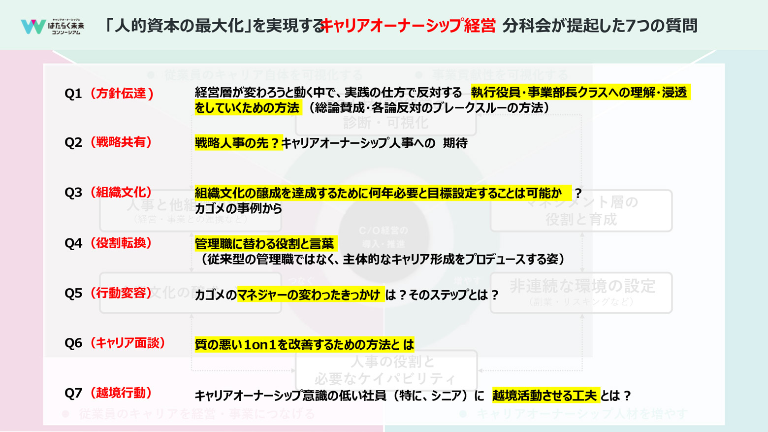 ありがとうございます。有沢さんがキャリアを切り拓く重要性に触れてくださったところで、本題に入りましょう。今開催している「キャリアオーナーシップとはたらく未来コンソーシアム」には、6つの分科会があります。その分科会から提起された7つの質問を有沢さんと一緒に考えていきたいと思います。
