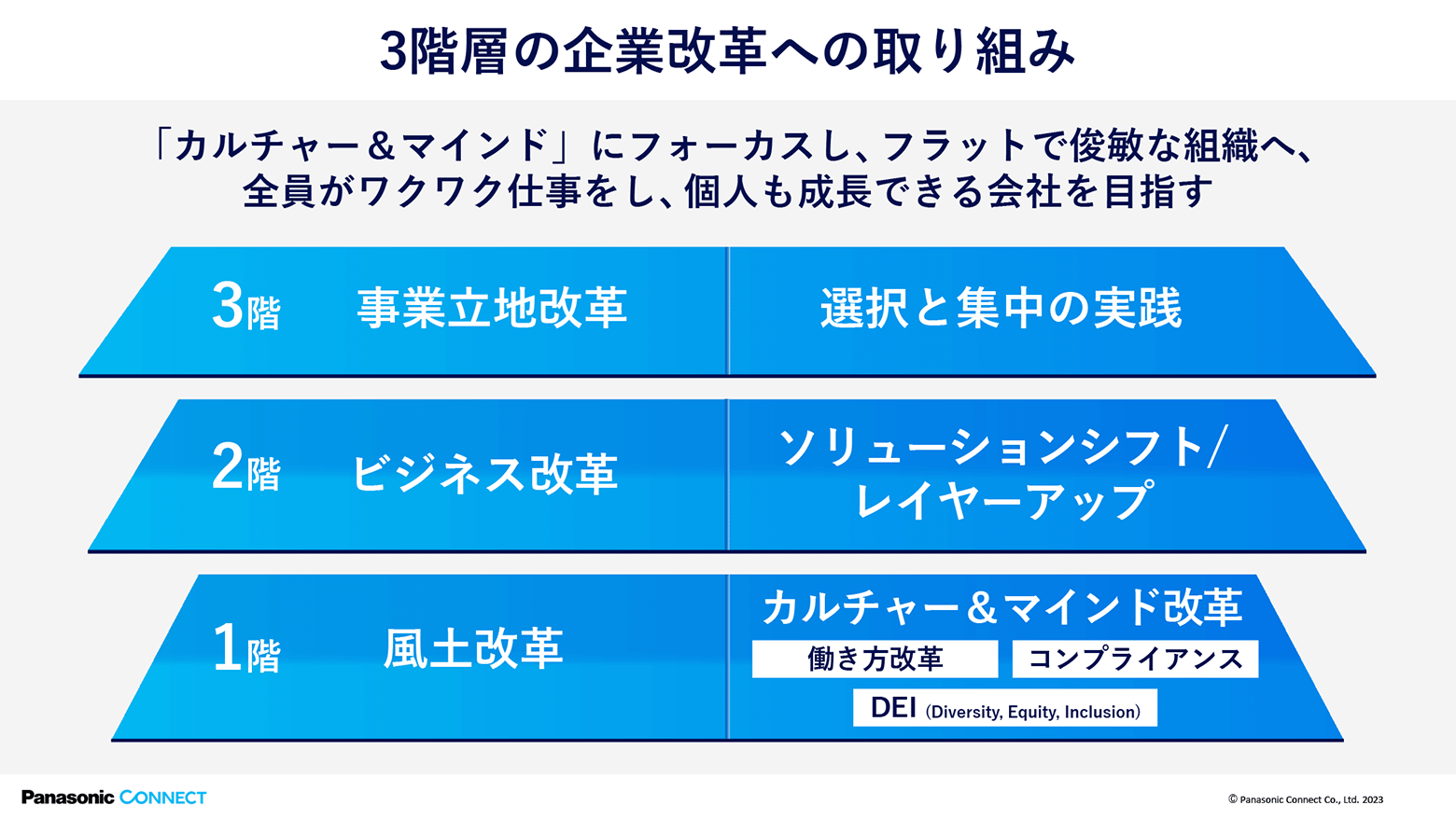 一番の肝として最初に取り組んだのが、カルチャー&マインド改革です。働き方改革、コンプライアンスの徹底、DEI(Diversity, Equity & Inclusion)などを進めていきました。