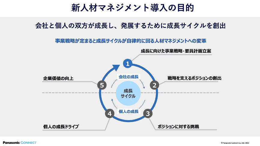 新家:そして、企業の成長に向けた事業戦略を明確に打ち出しました。その戦略を実現するポジションも同じく明確にし、従業員はそのポジションに対して挑戦することで、成長や成功を手に入れることができるようになります。このような個人の成長が結果として企業の成長や価値向上につながる成長サイクルをまわしていこう、との人事方針となっています。