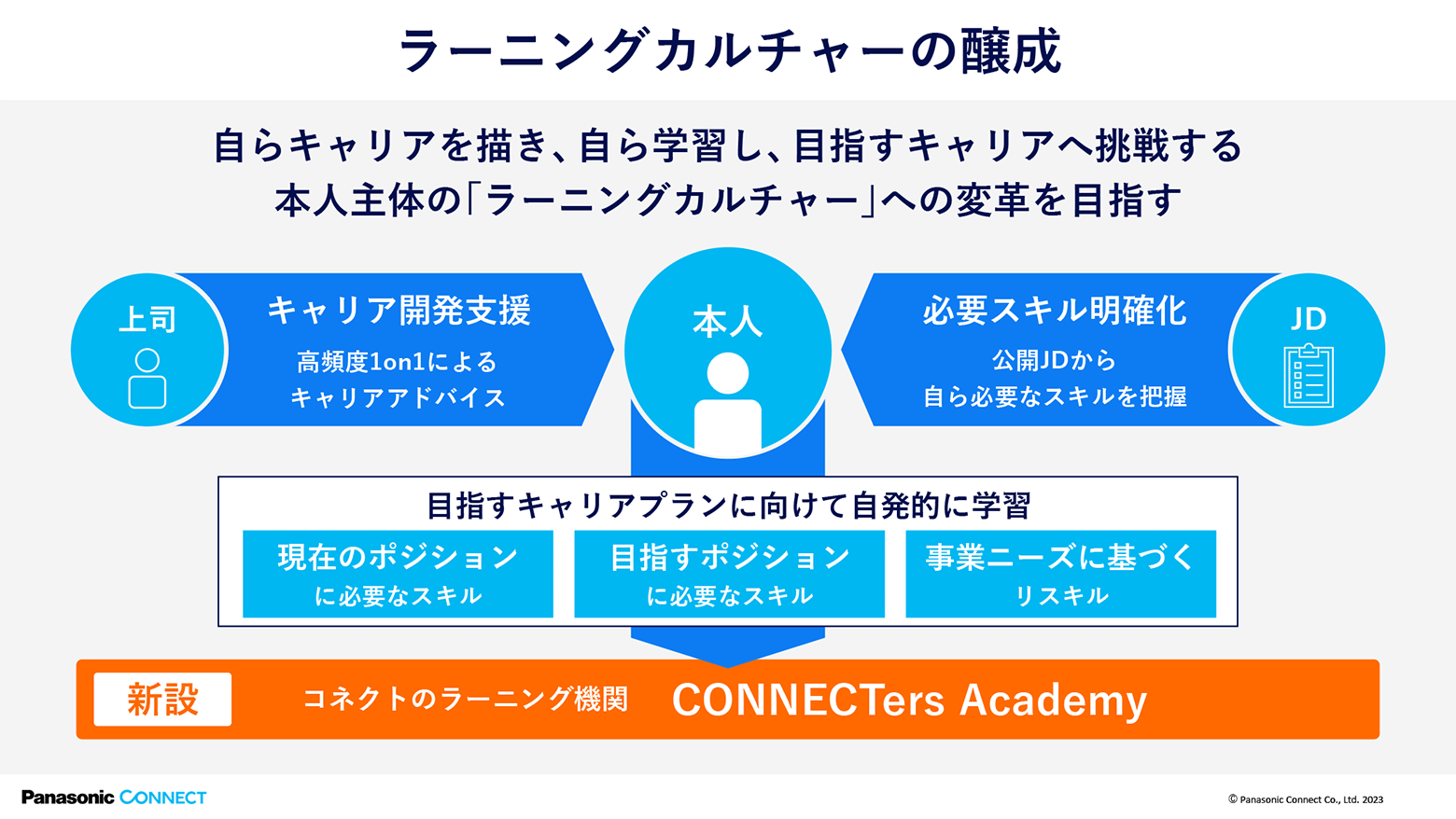 私たちパナソニック コネクトは、パナソニックのグループ会社ではありますが、グローバルで戦っていけるよう、いい意味で尖った会社、人材として、突出していく必要があります。実現するためには、どのような思考やスキルが必要なのか。社員一人ひとりが日常の仕事を通じて自ら考え、改善して、実施していくことができるような場づくりやしかけを企画、実施していきたいと考えています。