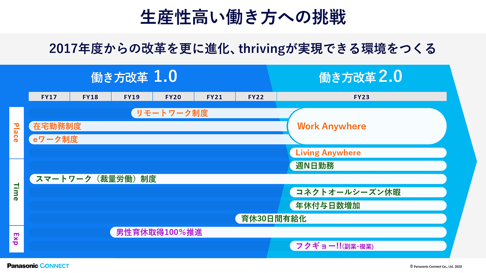 新家:2017年以降で整備してきた働き方に関する制度・仕組みは利用対象や目的が限定的でしたが、Place, Time, Experienceの観点で利用対象や目的を拡大していきます。2023年度から「働き方改革2.0」として更に個人が自律的に、よりイキイキと働ける環境をつくっていきます。