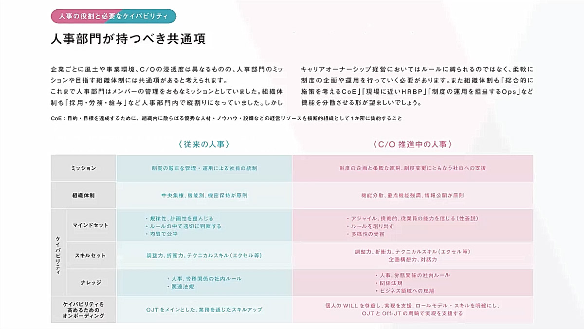次に、人事部門が持つ共通項として、先ほどの考えにのっとったときに、ミッション・組織体制、それを支える人事のケイパビリティを表で対比して見せています。また従来の人事とキャリアオーナーシップ経営人事で、対比をさせています。
