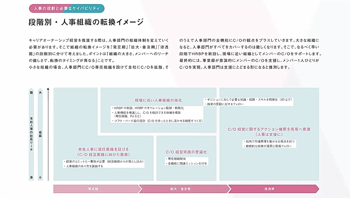左から右にかけて見ていくと、左は発足期で見る今日のキャリアオーナーシップが進んでいる状態。縦軸が本社人事の社員に対するリーチ度合い。上に行けば行くほど組織サイズが大きくて、社員へリーチしにくいというイメージで見ていただくとよいかと思っています。