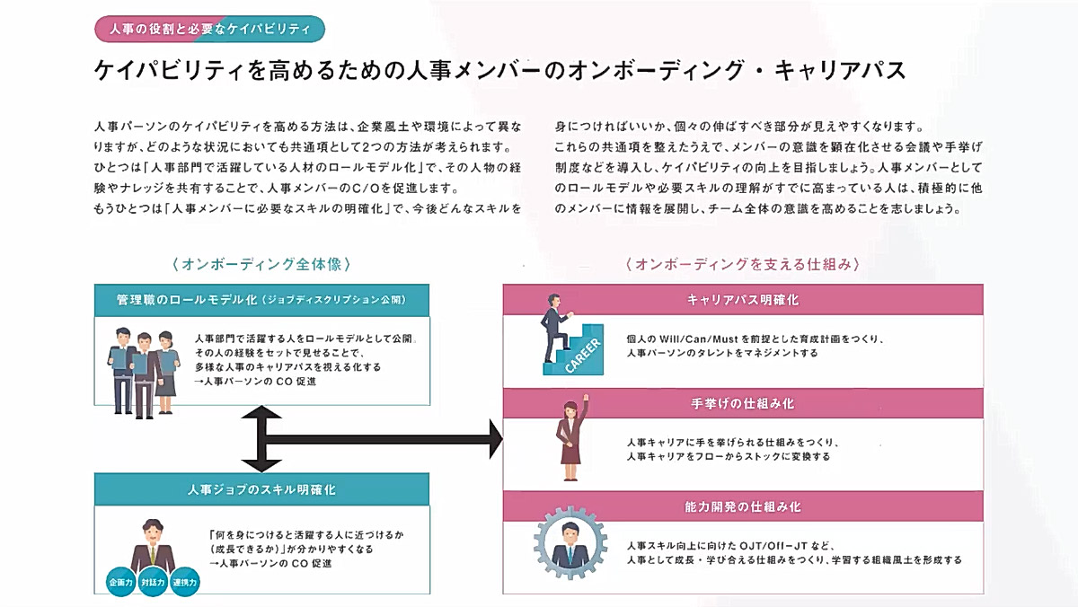 そのケイパビリティを高めるためのオンボーディング・キャリアパスも必要です。人事メンバー自身のキャリアオーナーシップも含め、どう実現していくか。今まではオンボーディングのみでやってきたところから、ジョブディスクリプション型で管理職や、今も活躍されている方が、どういうキャリアを歩んできたかを分析していく。