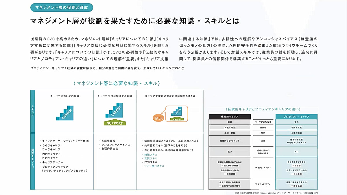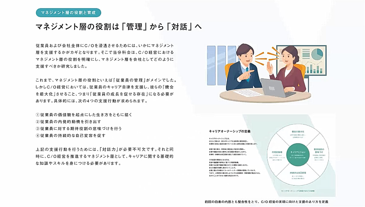 会社にキャリアオーナーシップ経営を浸透させるためには、その結節点となるマネジメントの役割を明確化し、役割を担っていただくための支援が非常に重要であると考えました。