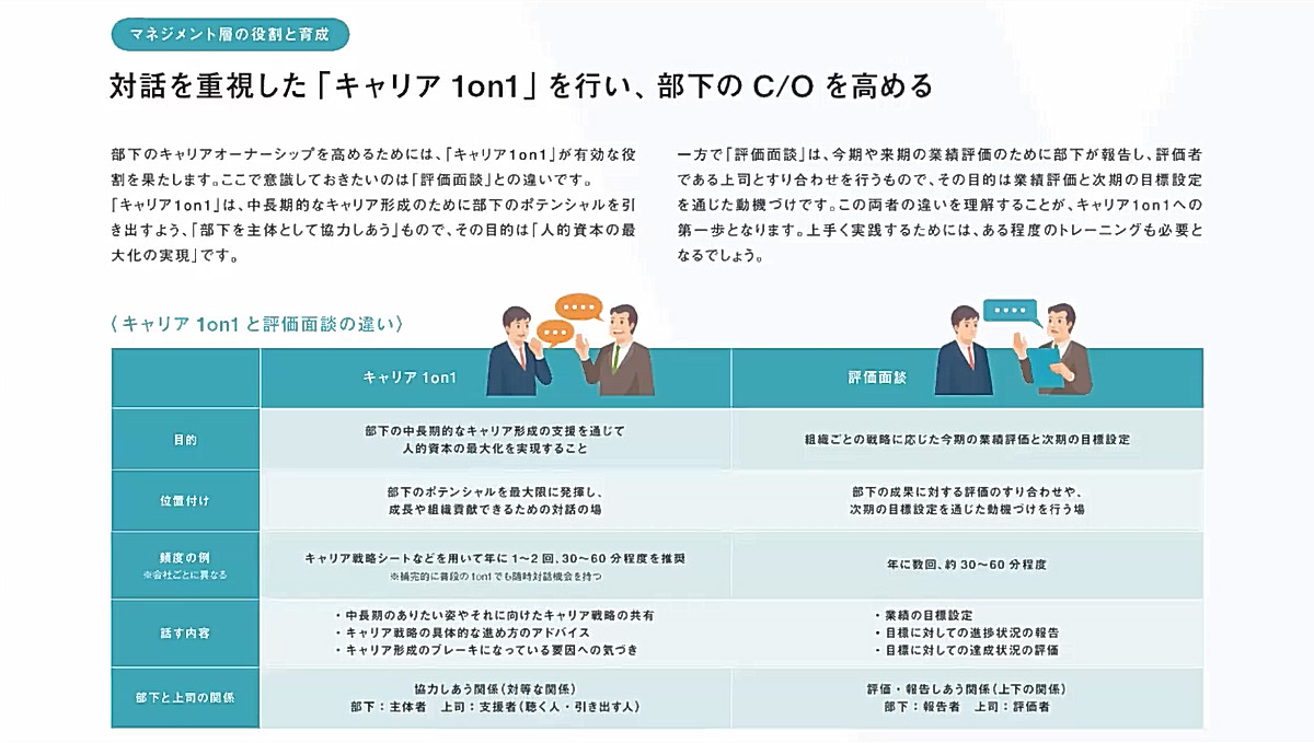 部下のポテンシャルを最大限引き出し、中長期視点での対応が重要ですが、どうしてもつい、評価面談のようにやってしまう方も多くいます。そうすると、1on1が逆効果になりかねません。キャリア1on1の時間は部下が自身で考え、気づきを得るための時間なのです。