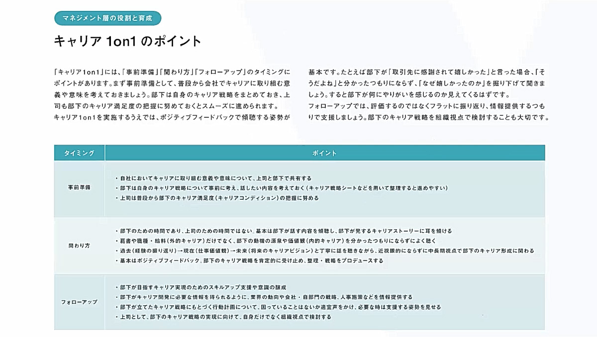 キャリア1on1は決して面談の場だけで完結するものではないということが、大切だと思います。キャリア1on1の進め方について、ある程度シナリオがないとイメージがつきづらいかと思い、あくまで参考として載せております。