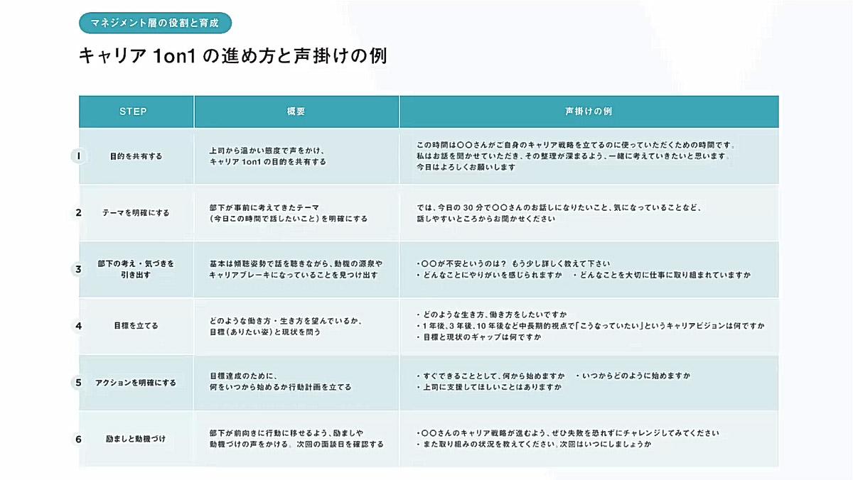 弊社も新任管理職向けに約40時間、よく1on1コーチングのトレーニングを入れています。実践の中でマネジメントがスキルアップしていただくことが、非常に重要だと考えています。