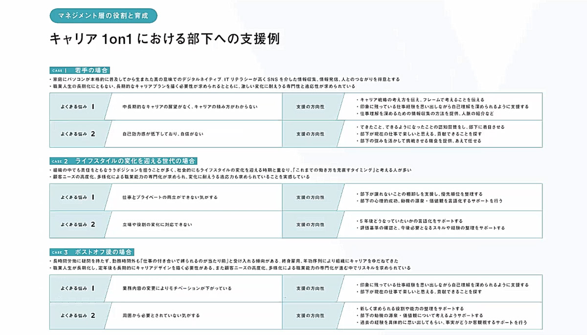 最後に、世代別、若手のライフスタイルの変化を迎える世代と、ポストオフ世代のよくある悩みや支援の方向性をまとめています。あくまで一律に関わるのではなく、部下が語る悩みやキャリアストーリーに耳を傾けることが大事と思っていますので、ぜひご参考になさってください。