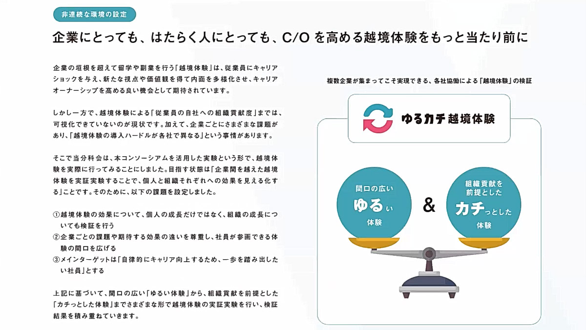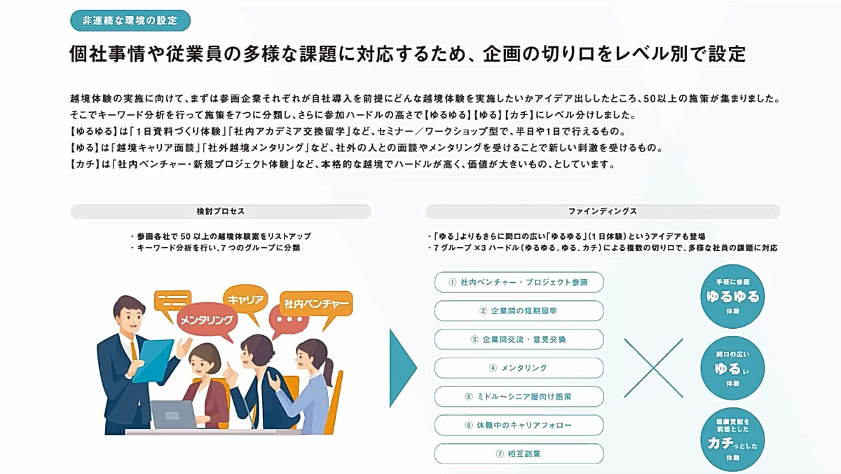 越境体験にフォーカスして、いろいろな種類のチャレンジの方法があると議論になりました。結論はカジュアルな越境体験と、組織や経営に資する越境体験の2つが必要だろうことです。それぞれ目的に合った越境体験を考えることが、今後必要になってくるのではないかと議論を進めてきました。
