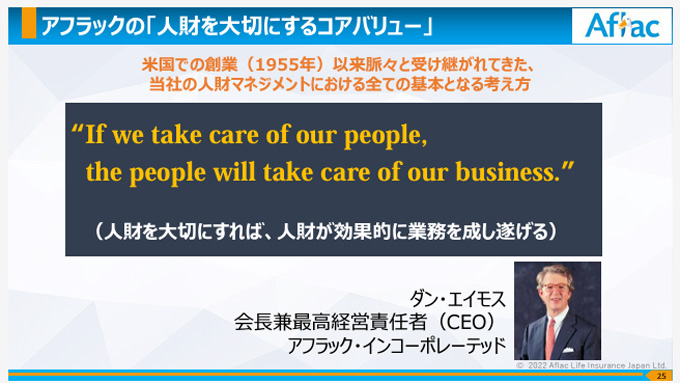 アフラック生命保険(以下、アフラック)さんは、アメリカで創業した1955年以来、「人財を大切にするコアバリュー(人財を大切にすれば、人財が効果的に業務を成し遂げる」という考え方を受け継いでいるそうですね。今年、日本での創業からちょうど50周年を迎えるとのことですが、この考え方に変化はありましたか。