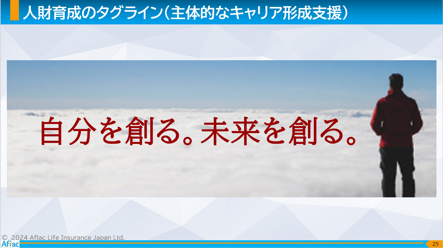 相原:主体的なキャリア形成に向けた意欲醸成に向け、コアバリューへの共感をベースとしつつ、当社は「自分を創る。未来を創る。」というタグラインを掲げ、人財育成プログラムを整備しています。これは、自らが成長し続けることで、アフラックの持続的成長を実現してほしい、という想いを表したものです。
