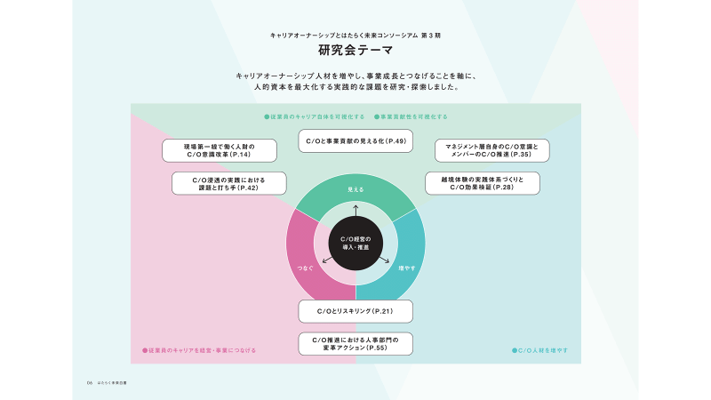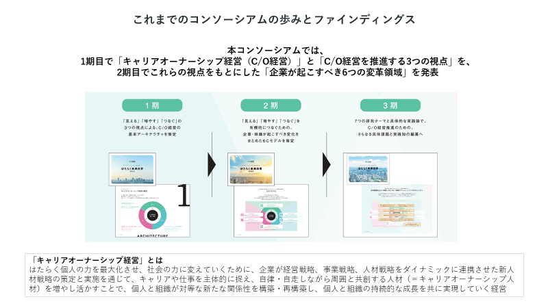 1期、2期、3期とそれぞれテーマがありまして、1期は、キャリアオーナーシップ経営が非常に大事だというテーマが見えてきて、2期の中ではそれがどのように変化を起こしていくかというお話。3期ではキャリアオーナーシップ経営を実践していくと何ができるのかという議論を皆様と続けてきています。