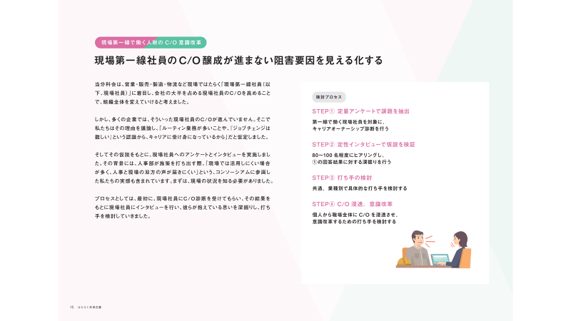 テーマが第一線社員ですので、まずは第一線の声を聞かなければいけないということで、検討プロセスが右に載っております。まずアンケートの方で課題の抽出を行いまして、その後実際に定性インタビューを行い、社員の皆様の声を聞いて仮説の設定をしてまいりました。