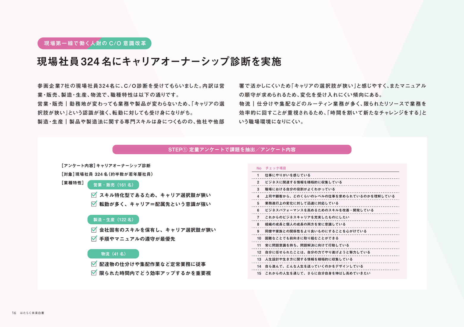 今回は我々9社の中でも、さまざまな業態、キャリアオーナーシップの推進状況というところも踏まえまして、可能な限り実行しやすい打ち手として1と2にフォーカスをし、施策を考えていきました。