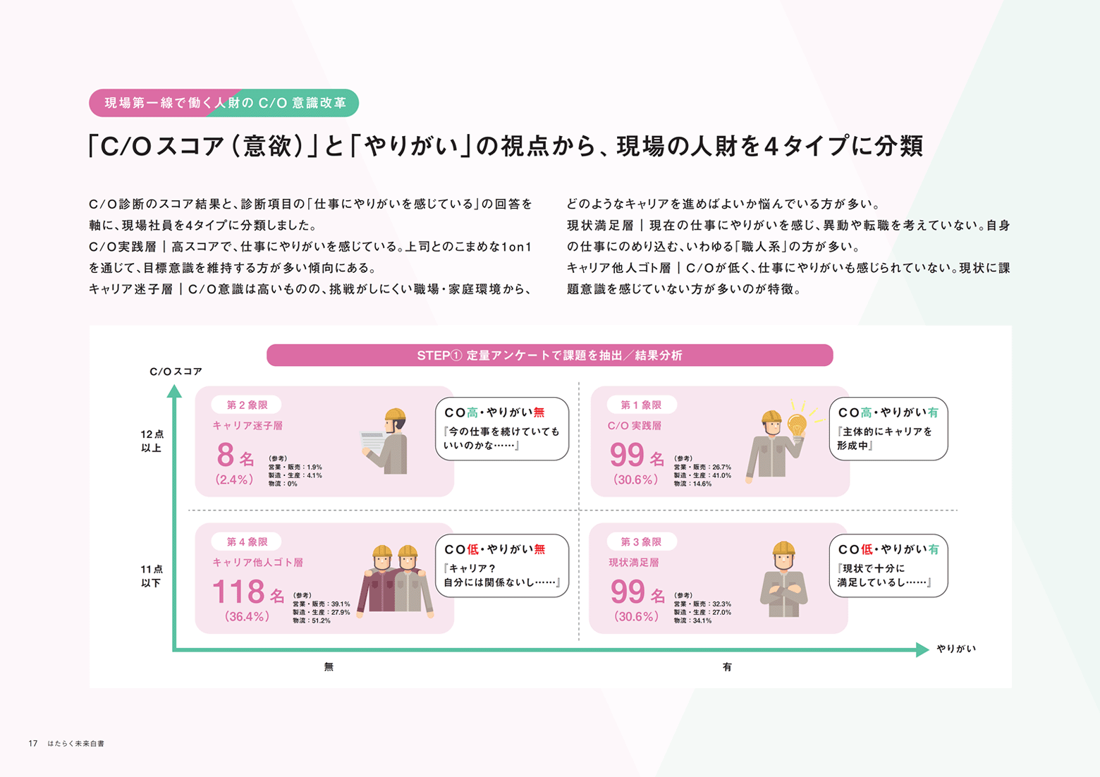 第1問「仕事にやりがいを感じている」。この「やりがい」を1つキーポイントに置いて、仕事に対する「やりがい」と、各15項目の「スコア」という2つのポイントに焦点を置いて、定量アンケートの課題抽出・集計を行いました。そして「やりがい」と「スコア」の視点から実際に現場の人材を4タイプに分類しました。