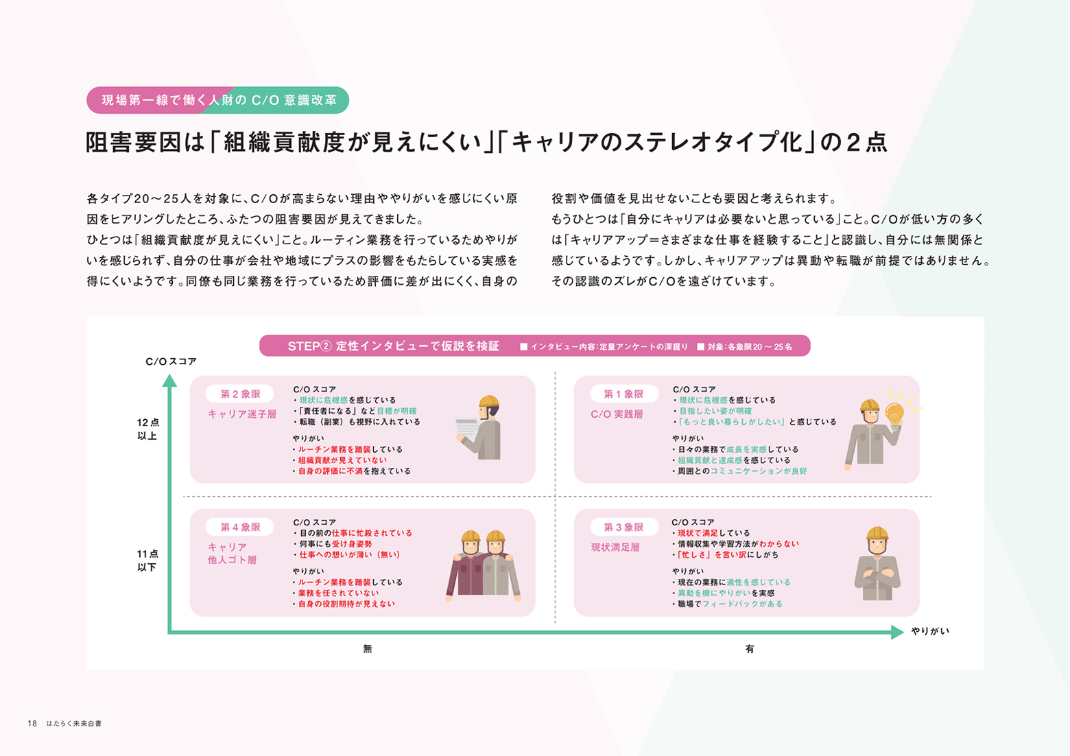 例えば第2象限の「スコア高いがやりがいが低い方」であれば「成長していきたい。でも今の仕事でいいのかな」と迷子になっている人が多いのかもしれない、などと仮説を立てて議論を続けていきながら、我々の作った課題、仮説が合っているかを定性インタビューで検証したという過程を踏んでおります。