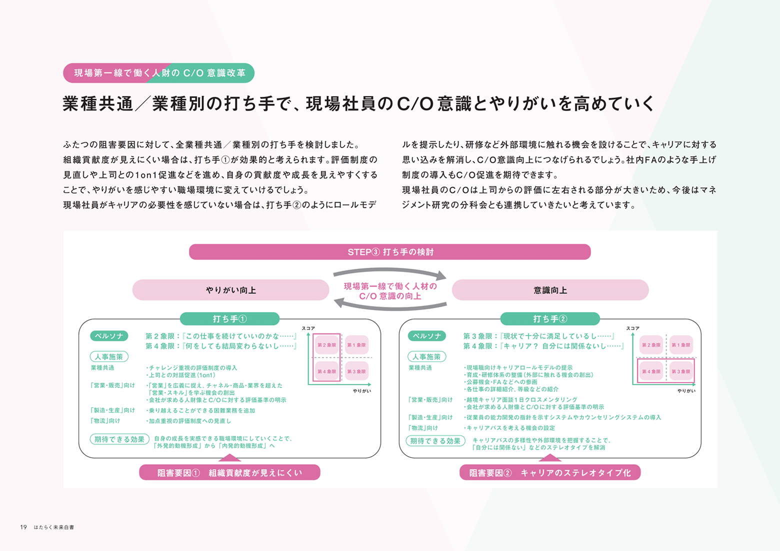 2つ目は右のラインになります。キャリアに対してどう思うかとに関しては、ここも自分一人で解決するのは難しいところですので、例えば前に我々が取り組んだ現場社員の独自のキャリアロールモデルの提示を、会社側からする。