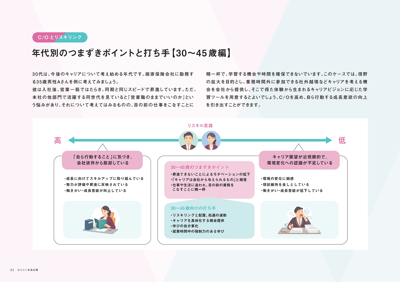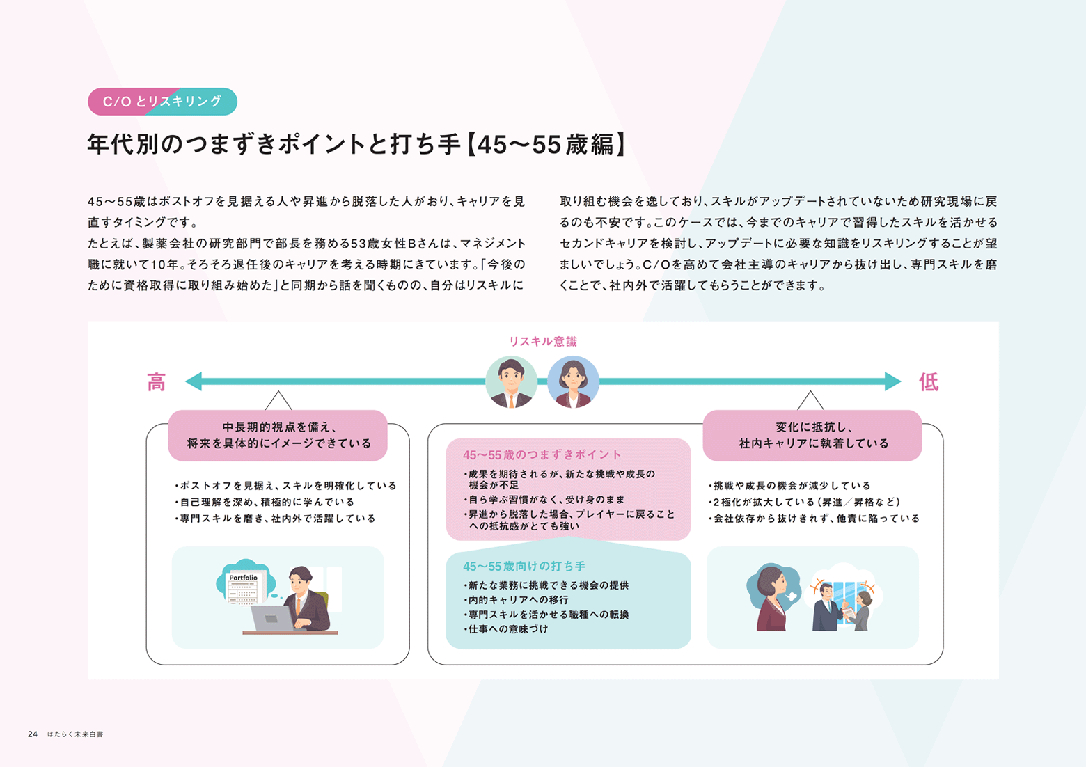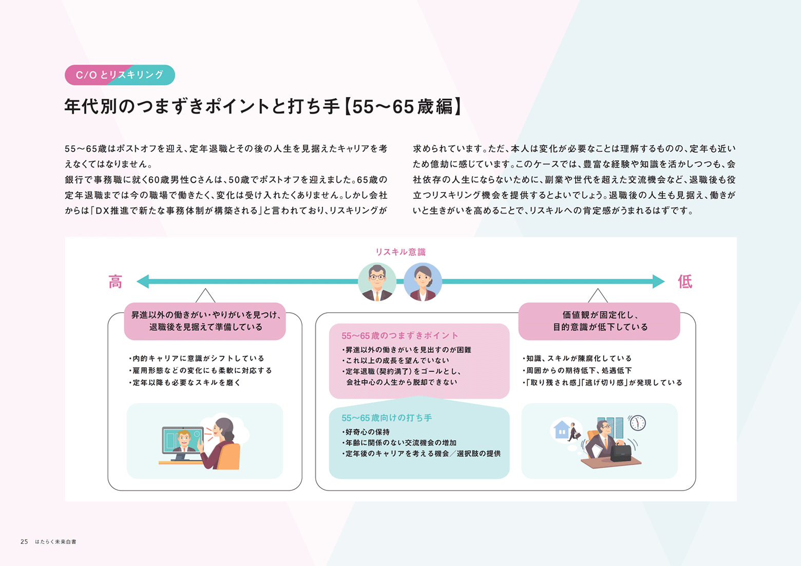 やはり価値観の固定化により目的意識が低下しているため、改めて何をリスキリングをするのかという目的意識、他の世代から刺激を受けて新たなチャレンジを打ち出していきたいところです。