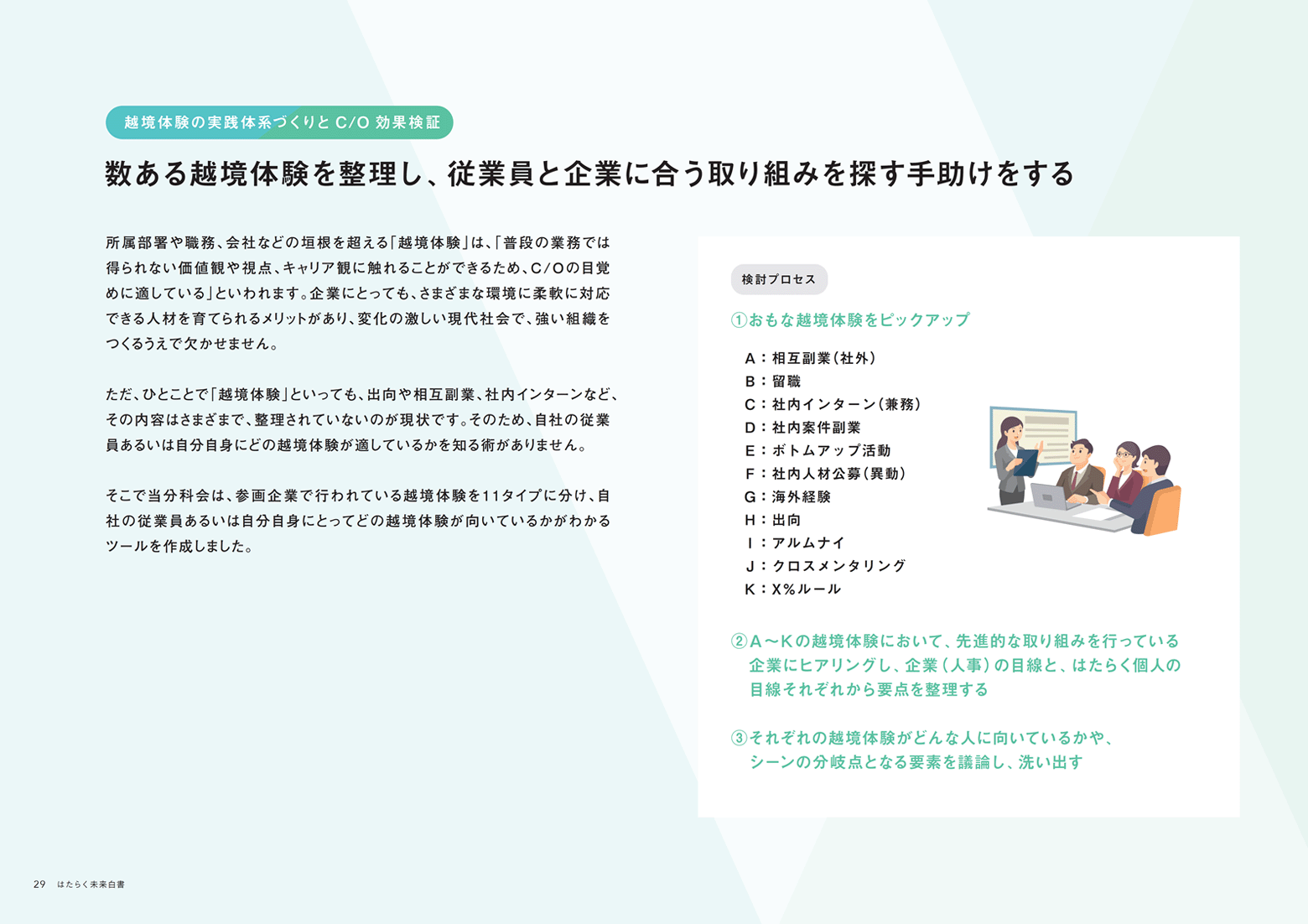 皆様の企業現場でもその多様性を感じているでしょうが、その理解を深めていただければと思います。誰にどの越境活動が向いているのかということに挑戦したのがこの分科会チームです。