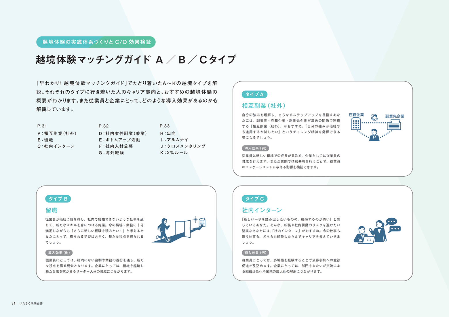 ここからスライド3枚くらいに渡ってAからKタイプまで。それぞれの施策がマッチするキャリア志向タイプや、実例に基づいた導入効果というものをまとめております。