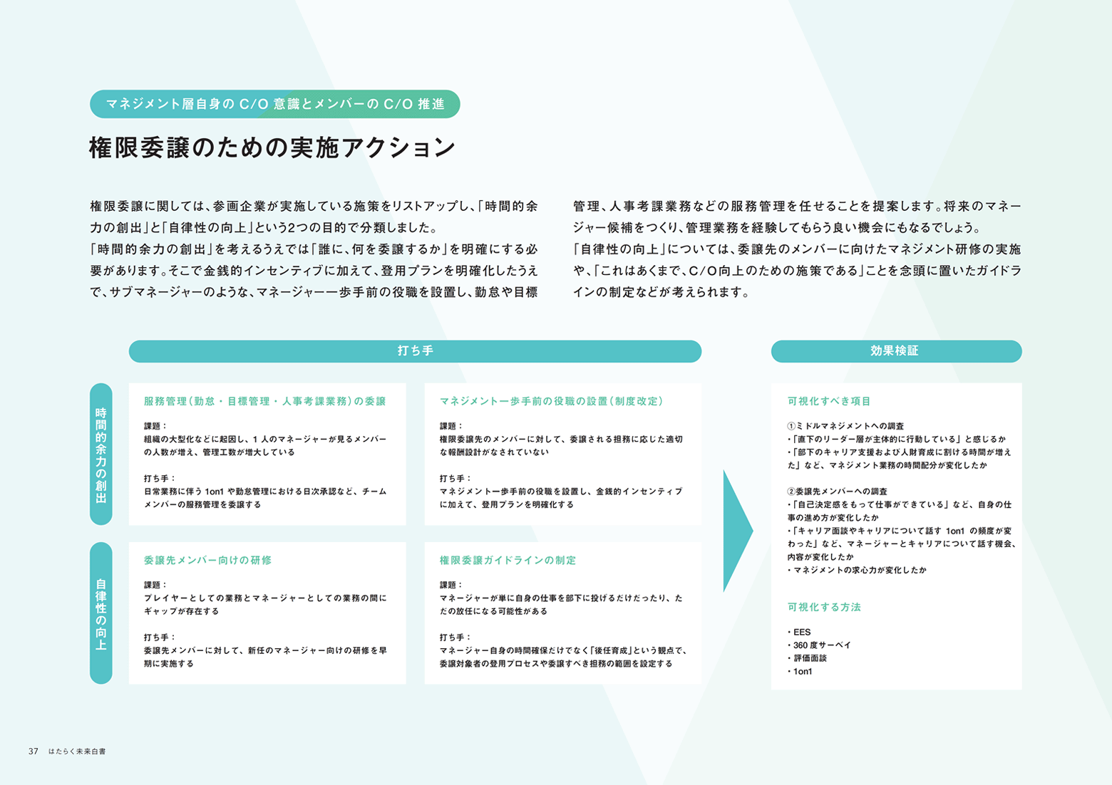 そしてもちろんこれだけでも一定のハードルがあると思うのですが、実際に導入をしてみて部下の意識の変化や管理職自身の時間的余力の創出につながったのかどうか、記載しているようなサーベイや1on1、EES等の手法で可視化していただくことをお勧めいたします。