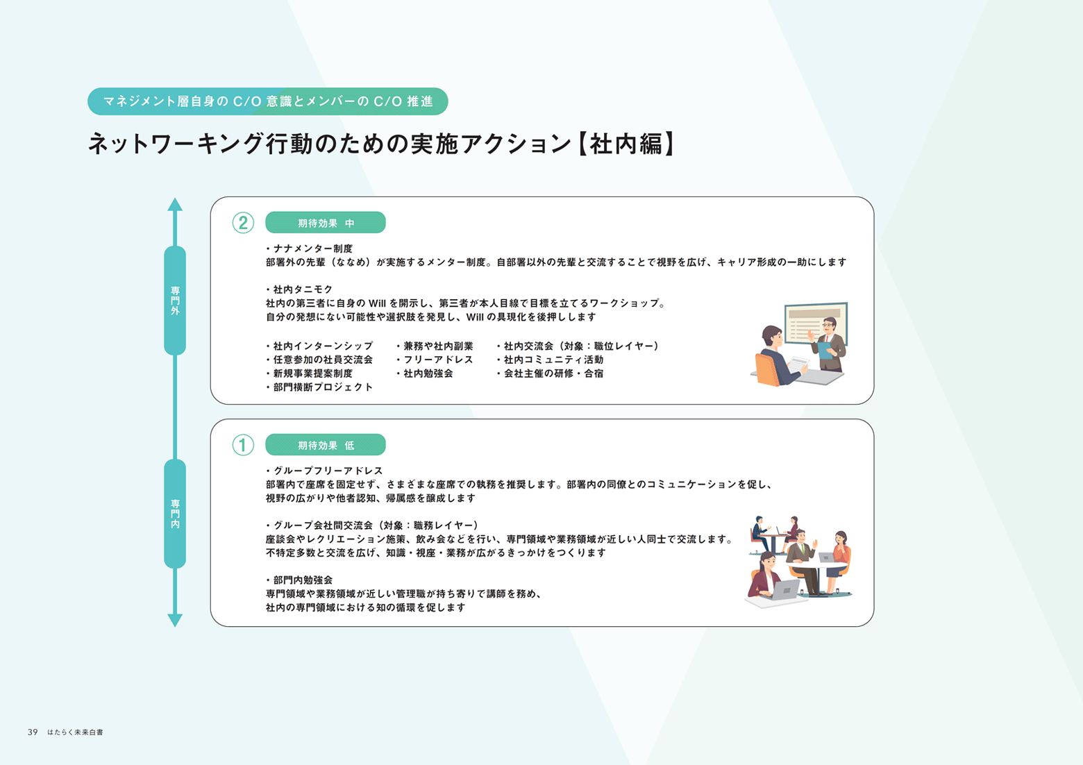例えば、社内の取り組みでしたら、社内で斜めエンター制度を用いたり、インターンシップをしたりといった取り組みも考えられますし、グループフリーアドレスで、自分の専門外の社員との交流を促すような仕掛けということも取り組めると思います。