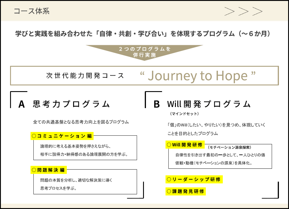 松田:「次世代能力開発コース」は「Journey to Hope」というテーマのもと、半年間かけて「個」のWill(したい、やりたい)を見つめ、会社や社会を変えていくことを目指す「Will開発プログラム」も含んでいます。単なる学びを得る研修ではなく、あくまで実践を意識したアクションラーニング型のプログラムを構築しています。ブレンディッドラーニング方式を取り入れながら、自律的に学びを深めていくコミュニティを形成し、「2030年に向けた会社への提言」をまとめて発表してもらう予定です。