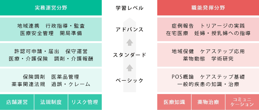 また薬剤師自身も企業を選ぶ際、いかにスキルアップできるかを非常に重視します。弊社では、このGOESを教育基盤として、様々な教育研修機会を設け、薬剤師の専門教育支援を行っています。また、薬局長やブロック長などキャリアが上がっていくと、専門教育に加え、コミュニケーション力や考える力などの「コンピテンシー」、医療を通じてどう社会に貢献するのかといった「マインド」や「仕事を通じた経験」がより重要になってきますので、キャリアの節目で「4つの育成視点」に沿って振り返ることも行ってきました。