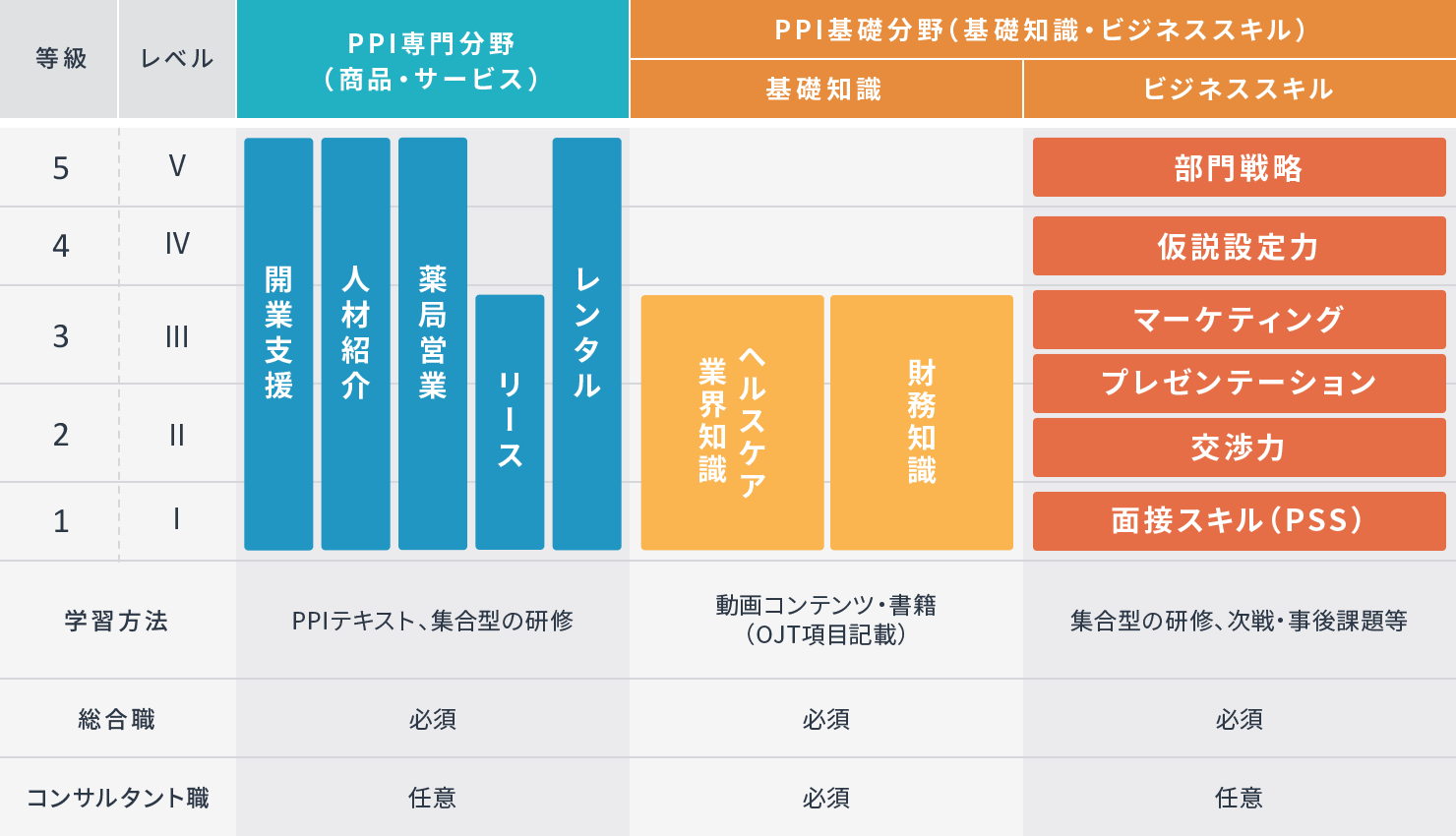 PPIは3つの分野で構成し、具体的には、医師の開業支援や人材紹介、医療モール開発など事業サービスに必要となる「専門分野」、医療業界や財務などの「基礎分野」、コンサルティングに必要となる面談スキル・マーケティング・戦略立案などの「ビジネススキル」の3つです。各分野で必要な知識やスキルを体系的に学べる仕組みとしており、レベル認定を行っています。上位レベル保有者には後進育成に携わってもらう仕組みづくりも強化しています。こうした教育制度により、創業以来重視してきた、医療機関のパートナーとしてその信頼に応えることのできる高い見識を持った人財育成を目指しています。