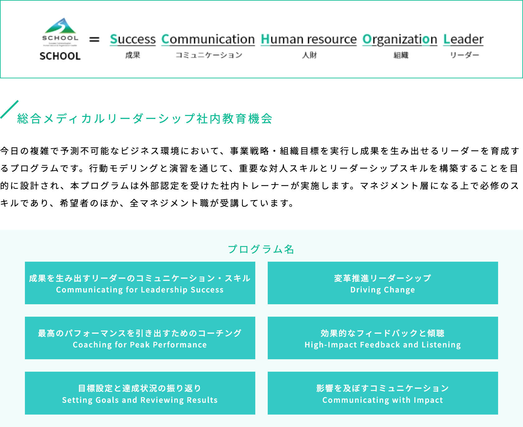 具体的には、事業戦略を実行し、成果を出せるマネジメント層の育成は、リーダーシップ開発プログラムである「SCHOOL」が担っています。その中には「成果を生み出すリーダーのコミュニケーションスキル」「目標設定と達成状況の振り返り」「変革推進リーダーシップ」などのプログラムがあります。