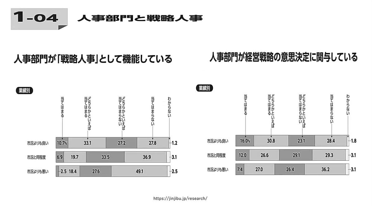 人的資本経営と、戦略人事との結びつきができている企業も限られます。人事部門が戦略人事として機能しているかどうかという設問においても、売上がいい企業では戦略人事が機能していますが、市況よりも悪い企業では機能していません。業績が悪い企業では、人事部門が管理業務に追われていらっしゃる。