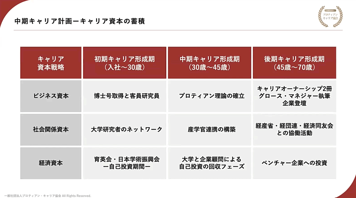 たとえばこんな図のように、キャリアを年代で分けて、資産を積み上げていく。そうすると、キャリアオーナーシップ経営を実現できるわけです。