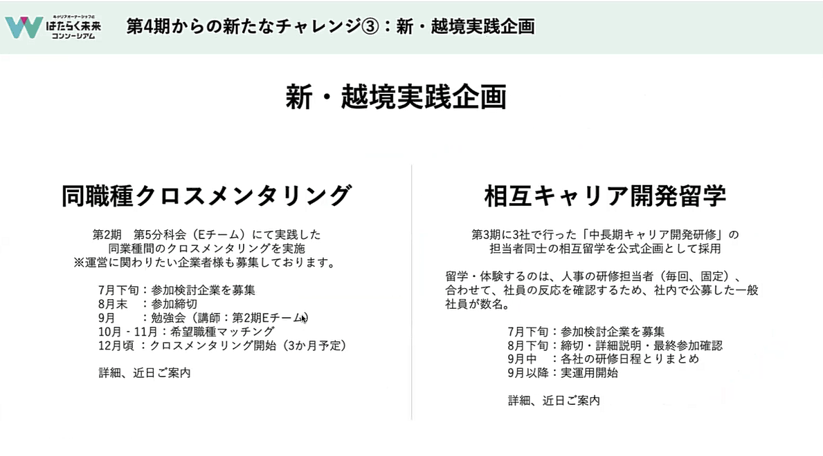 そして、毎年実施している相互副業は今年も開催しますが、それに加えて、同職種で越境していただく「同職種のクロスメンタリング」、および「相互キャリア開発留学」を企画いたします。相互キャリア開発留学では、他社の「中長期キャリア開発研修」を受けていただくことにより、相互に学習していただくものです。人事以外の社員もお連れいただくことで、反応をみていただくことができます。興味がある参画企業の方は、ぜひご連絡ください。