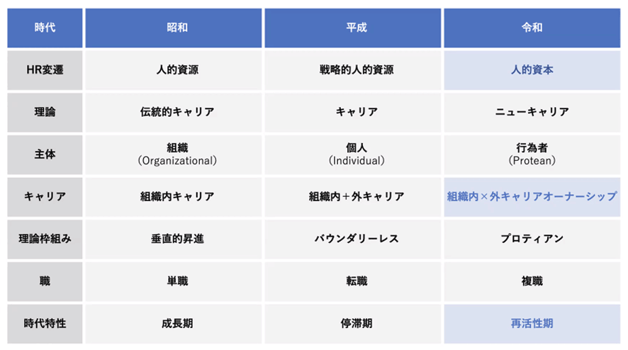 昭和の時代、キャリアとは「組織内キャリア」にとどまっていました。その後、転職を前提とした「戦略的人的資源」という発想が生まれました。