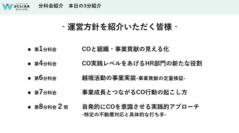 また、本日は上記の分科会以外にも進捗を報告してくださるグループがありますので、よろしくお願い申し上げます。