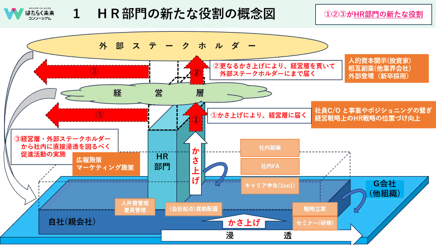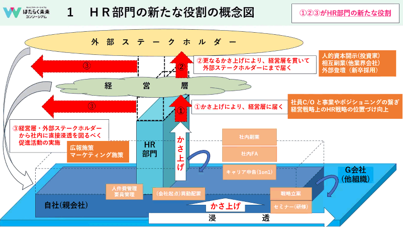 キャリアオーナーシップを促進するうえで、人事は何ができるのか、かさ上げとは何か。現在の私たちは、「人事が外部ステークホルダーに情報を発信できる」立ち位置になると考えています。