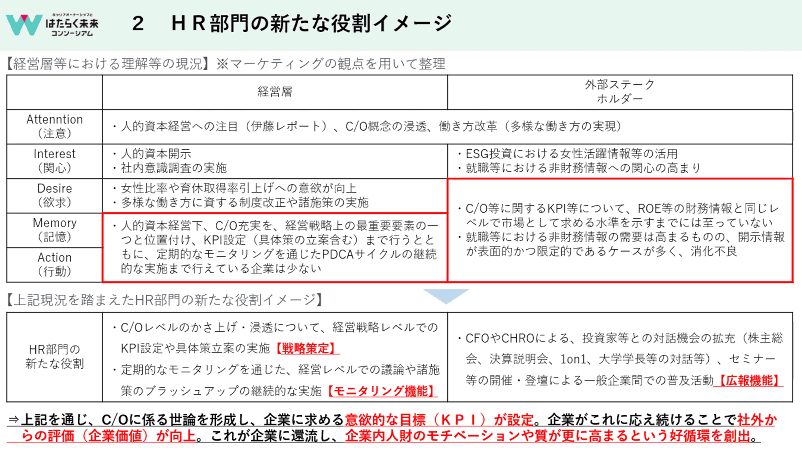 ――具体的に、外部ステークホルダーにも、人事が重要だと感じていただくための施策ですね。私たちは戦略策定・モニタリング・広報、3つの役割が必要だと感じています。