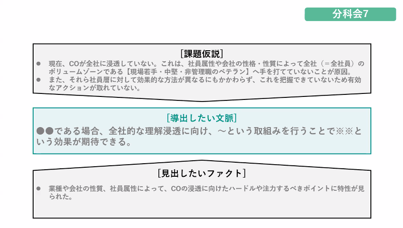私たちは、「事業成長とつながるキャリアオーナーシップ」を実現するための、具体的なアクションを議論しています。他の分科会では経営陣、不動層へのキャリアオーナーシップ推進を進めるための分析がなされていると思いますが、私たちは業種や会社の性質、社員属性による特性に注目し、分析していく方針です。具体的には、「現場の若手、ミドル層、非管理職のベテラン」へターゲットを絞って打ち手を議論したいと思います。